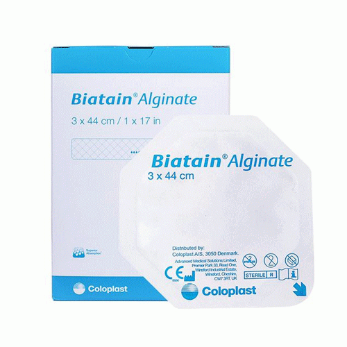 Biatain® Aljinat Ag, aljinat, karboksimetilselüloz (KMS) ve bir iyonik gümüş kompleksinden oluşan bir aljinat pansumandır.