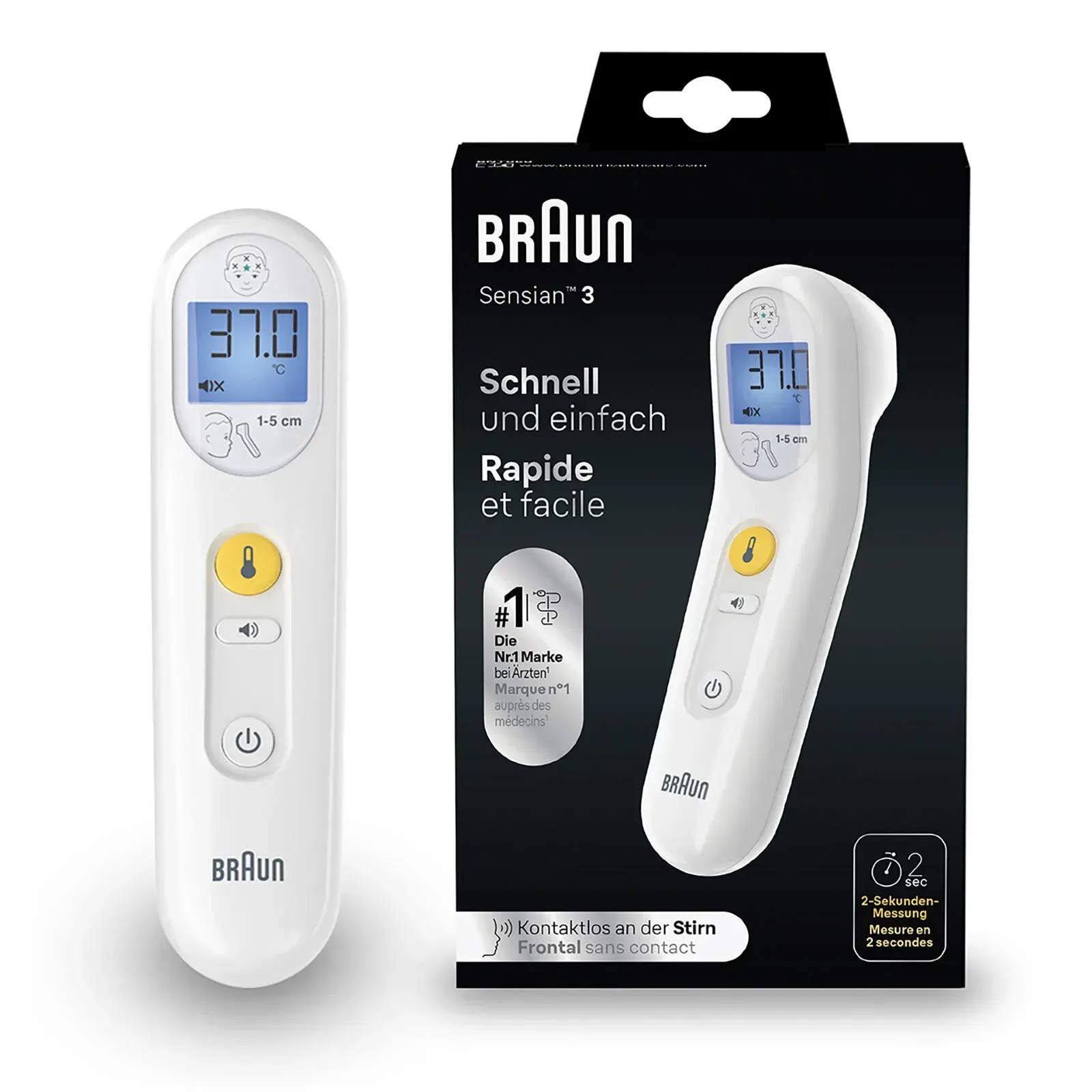 Braun Sensian™ 3 Temassız Alın Termometresi, bebekler, çocuklar ve yetişkinler için uygun, klinik olarak doğrulanmış ölçüm hassasiyeti sunan temassız ateş ölçerdir. Doktorlar arasında 1 numaralı marka olan Braun güvencesiyle geliştirilen bu alın termometresi, ateşi yalnızca iki saniye içinde hızlı ve doğru şekilde ölçer.Basit ve sezgisel tasarımı sayesinde evde kolay kullanım sunar. Temassız ölçüm teknolojisi hijyenik kullanım sağlarken, sessiz modu özellikle uyuyan bebekler ve çocuklar için konforlu ölçüm imkânı sunar. Dahili hafıza özelliği ise son ölçüm sonucunu saklayarak aile sağlığını takip etmeyi kolaylaştırır.