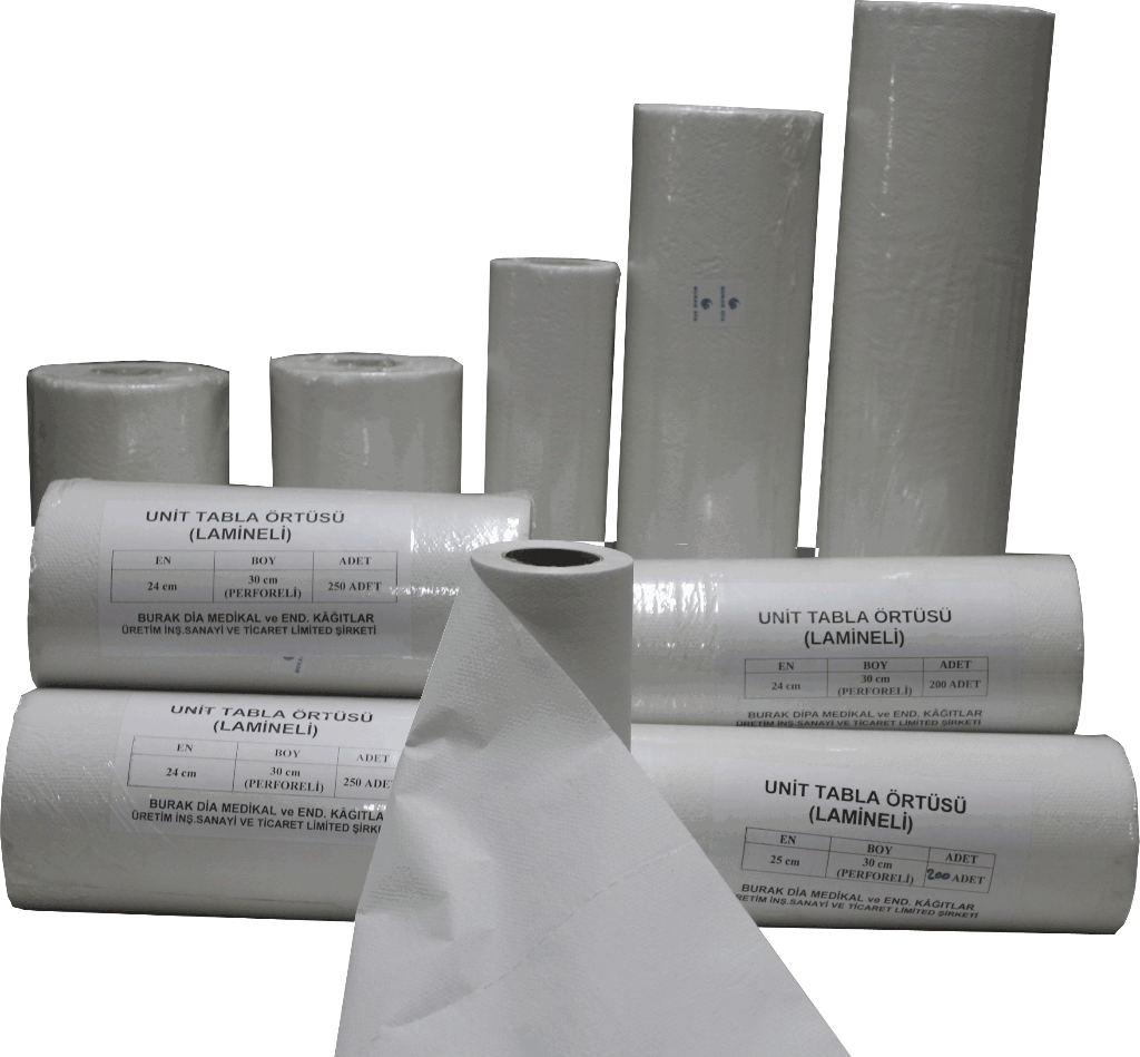 Dental ünit tabla örtüsü,diş hekimlerinin kullandığı aletlerin konulduğu tablanın hijyeninin muhafazası için disposable, çift katlı,altı naylondan, üstü selüloz kağıttan, rulolar halinde üretilir.