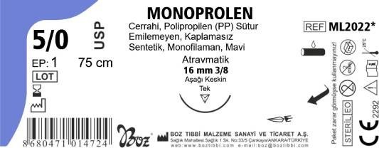 Monoprolen, Boz Tıbbi Malzeme Sanayi tarafından üretilen yüksek kaliteli, emilmeyen polipropilen (PP) cerrahi sütürdür. Monofilaman yapısı sayesinde doku içinde sürtünmeyi azaltır ve geçişi kolaylaştırır. Kaplamasız yapısı ile üstün doku uyumu sağlar, pürüzsüz yüzeyi sayesinde minimal travma oluşturur.