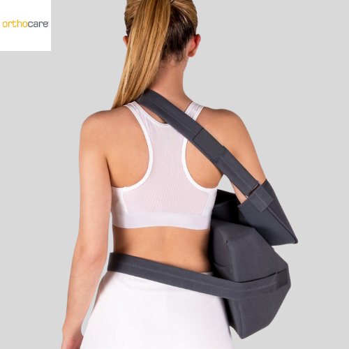 Omuz ekleminde abduksiyon hareketini desteklemek ve omuz bölgesindeki iyileşme sürecini hızlandırmak amacıyla tasarlanmış, ayarlanabilir omuz abduksiyon yastığı.