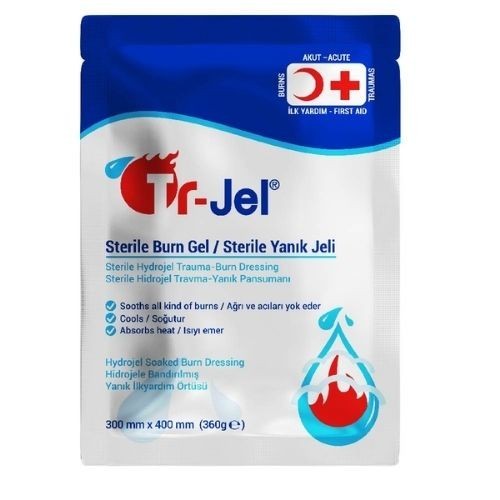 Orta boy yanık bölgeleri için uygun, serinletici ve ağrı hafifletici etkili, jel bazlı steril yanık örtüsü.